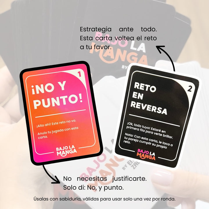 • Carta ¡NO Y PUNTO!: Agrega un giro táctico al permitirles bloquear un desafío… a menos que su pareja decida anularlo.